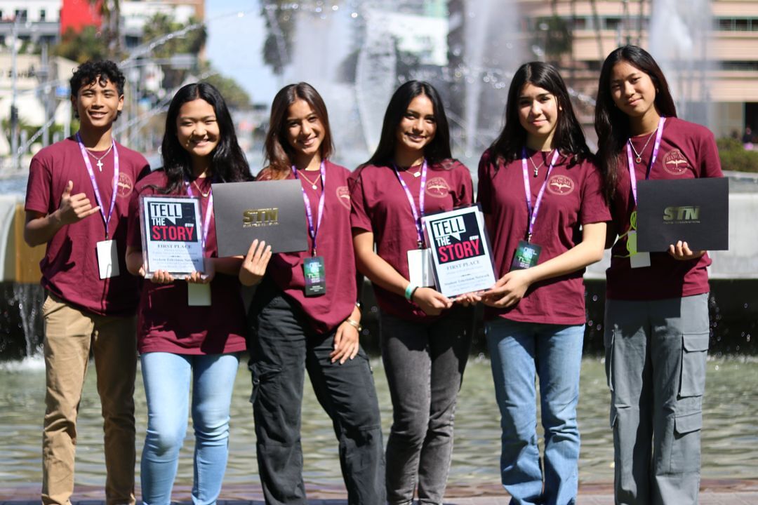 KS Maui haumāna Kaʻikena Guzman, Lyla Yamashita, Hinatea Kodani, Keiana Tuitele, Ciara Poepoe and Mia Wunder (from left to right) won several awards at the 2024 Student Television Network National Convention.
