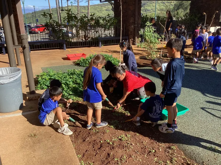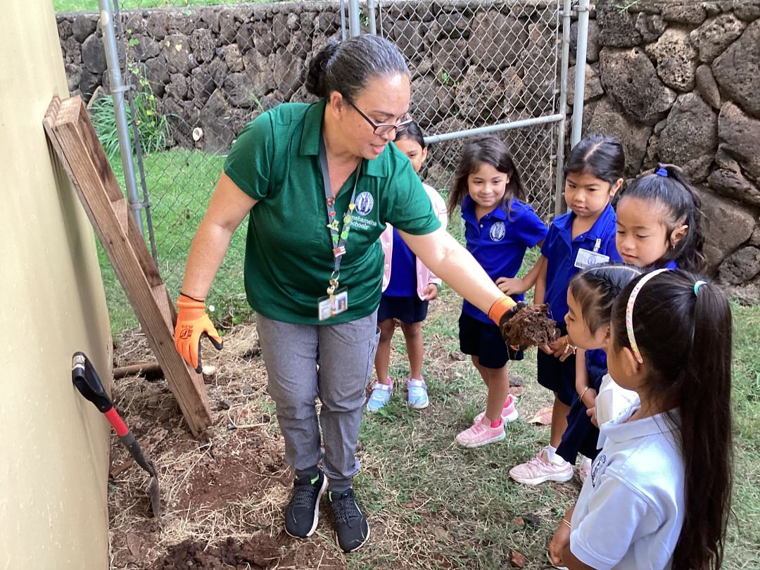 My haumāna make me smile every single day! Especially in the māla. I love to see the growth of our haumāna in the māla. They begin in kindergarten, just enjoying playing in the dirt. Throughout the year, they learn from all our kumu that working together during our māla time, this māla — this ʻāina — belongs to them. They learn to mālama this place, not just for themselves, but also for the keiki who will come after them. By the end of first grade, they are actively looking for ways to better our māla, our plants and our ʻāina. Nani!