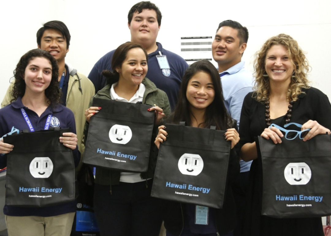 The KSK Microgrid Challenge first-place winners successfully pitched a plan for energy conservation, energy efficiency and renewable energy generation opportunities for their campus. They are, front: Emliy Medeiros, Kiai Mielke and Jamie Nakamura with Chelsea Harder of Hawaii Energy, and back: Makoa Mau, Maluhia L’Hote and Isaia Padilla-Ku.