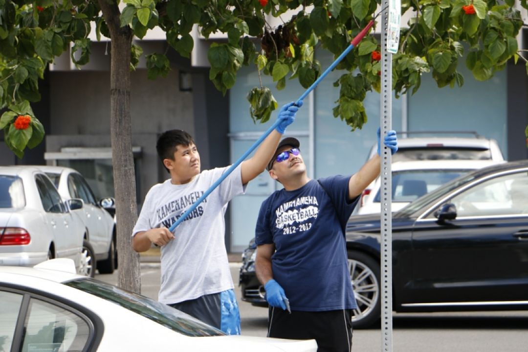 The cleanup was a kākou (cooperative) effort. Together the team fanned out to pick up trash, scrub or paint out graffiti, and scrape off old posters and stickers from area structures.
