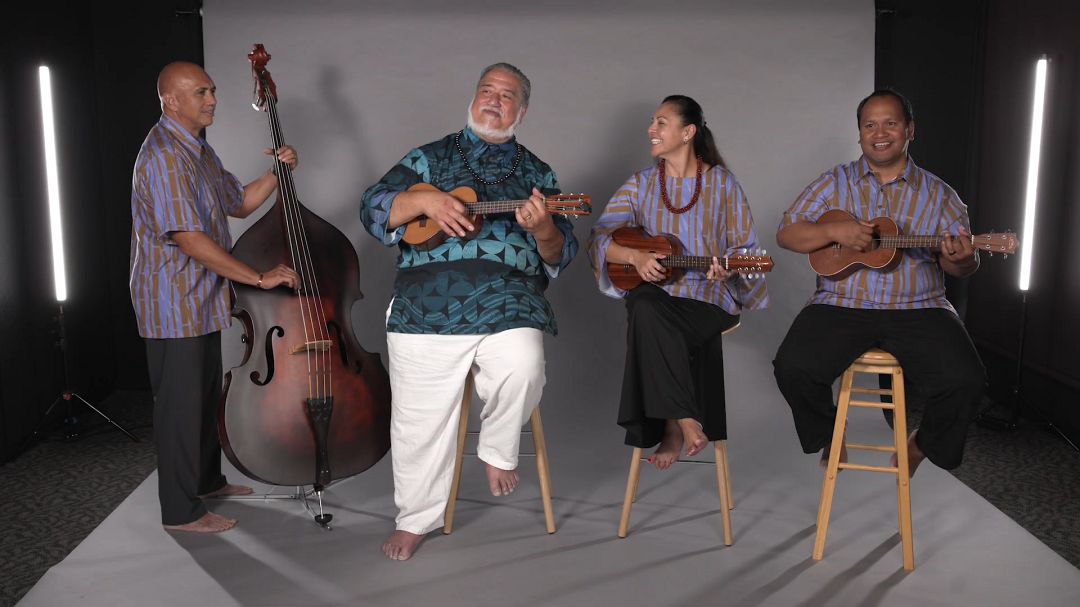 Kahu Kaunaloa Boshard KSK’77 (from left), KS cultural consultant Hauʻoli Akaka, Kahu Kanani Franco KSK’91 and Kahu Manu Naeʻole KSK’96 gather to sing their rendition of “ʻEkolu Mea Nui.”