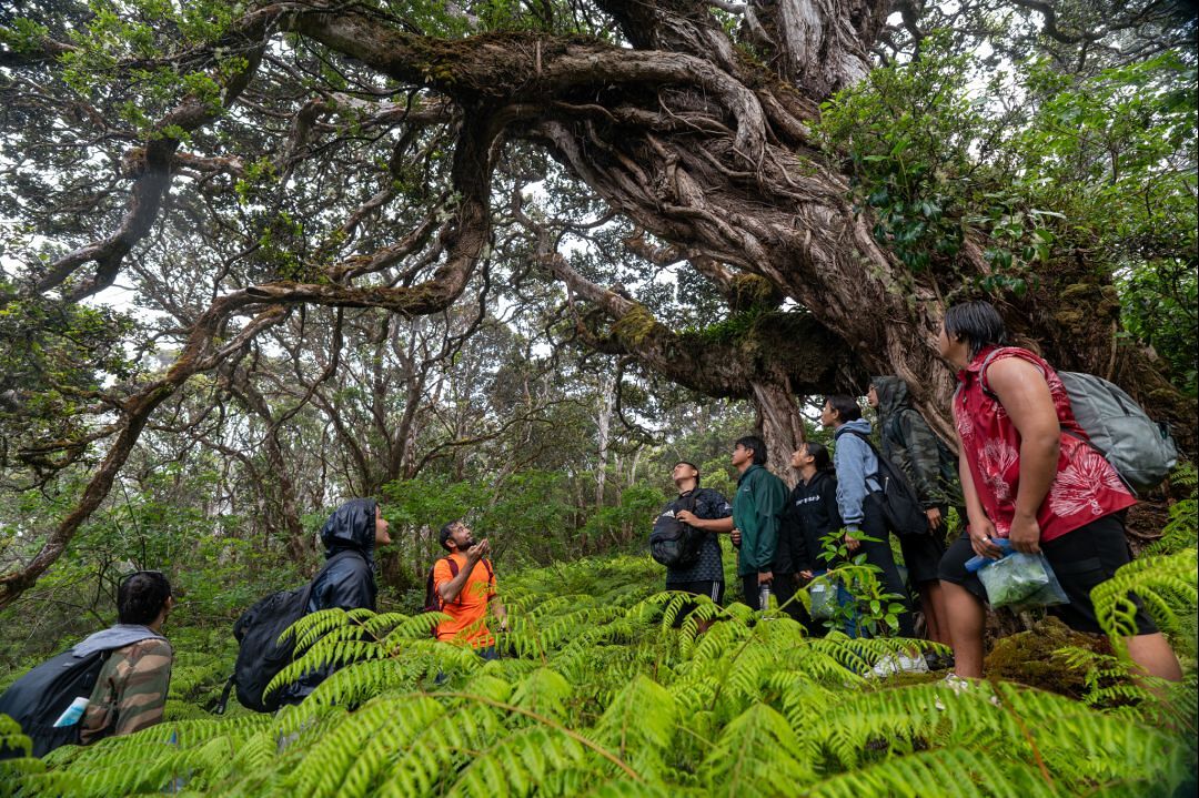 A group of six high school haumāna and two kumu were guided on a three-mile hike through The Nature Conservancy's Waikamoi Preserve near Haleakalā National Park. The group was in awe as they reached the more than 80-foot-tall tree and 108-foot canopy.
