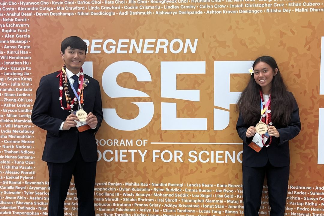 The two haumāna earned a Third Award and a $1000 prize in the environmental engineering category at the Regeneron International Science and Engineering Fair in Los Angeles. Dubbed the Olympics of science fairs, 1,700 students from across the globe competed for prizes. There were some 80 entries in Merritt and Bennett’s category alone.