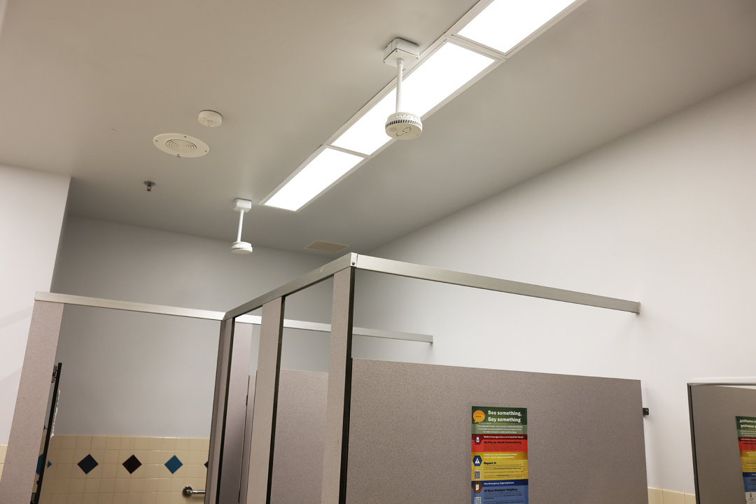 There is no camera or audio recording to protect privacy. But it will generate an alert to support intervention and our commitment to student wellness. Alerts can be synced with monitoring cameras located outside in hallways which may be used in identifying students who may need to participate in follow-ups to incidents if they occur. Devices will be installed in select high school bathrooms to start the school year, and be rolled out to middle school later in the year.