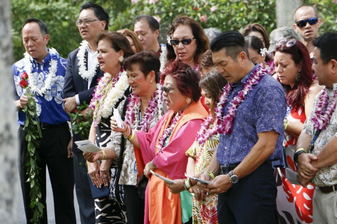 On the morning of the ceremony, service awardees stood outside the gates of Mauna ‘Ala and offered the Kamehameha Schools staff oli (chant), “Nā Kini Pua Lei Mamo Hawaiʻi,” (Generations of Hawaiian Youth Blossoming Forth).