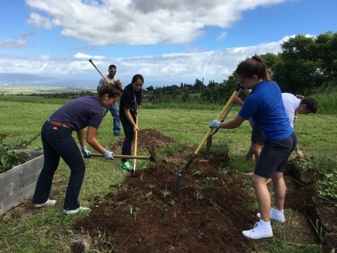 Kumu Kehau works with senior seminar students to prepare the garden for new plants. Kapikohānaiāmālama is the outdoor educational space for the K-12 students at the Maui Campus.