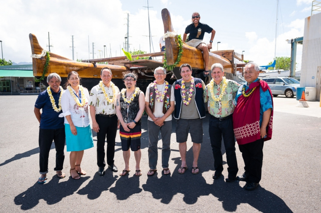 This month’s Pacific Conversations virtual talk show focuses on KS partner Sealaska’s gift of two cherished Sitka spruce trees used to build the Polynesian voyaging canoe Hawaiʻiloa. The waʻa kaulua (double-hulled canoe) was honored during the 2019 Alaska-Hawaiʻi Hoʻoilina Conference. From left to right: Polynesian Voyaging Society President Nainoa Thompson, Bishop Museum President Melanie Ide, KS CEO Jack Wong, Sealaska Board Chair Joseph Nelson, Sealaska president the late Byron Mallot, Sealaska CEO Anthony Mallot, UH President David Lassner and KS Executive Culture Officer Randie Fong.