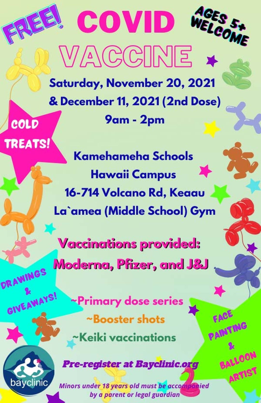 Now that the Centers for Disease Control (CDC) and Food and Drug Administration (FDA) have authorized the emergency use of the Pfizer-BioNTech pediatric vaccine for children ages 5 to 11, we wanted to provide an opportunity for convenience and familiarity should ʻohana choose to vaccinate their keiki.