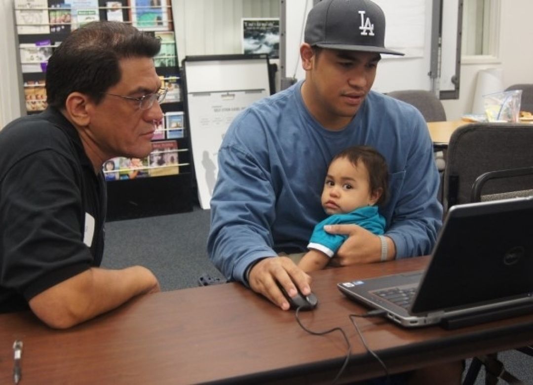 Fulfilling KS' educational mission includes easing the financial burden of education for needy families. Above, KS Post-High Counselor Koa Amona walks a young father through the financial aid application process.