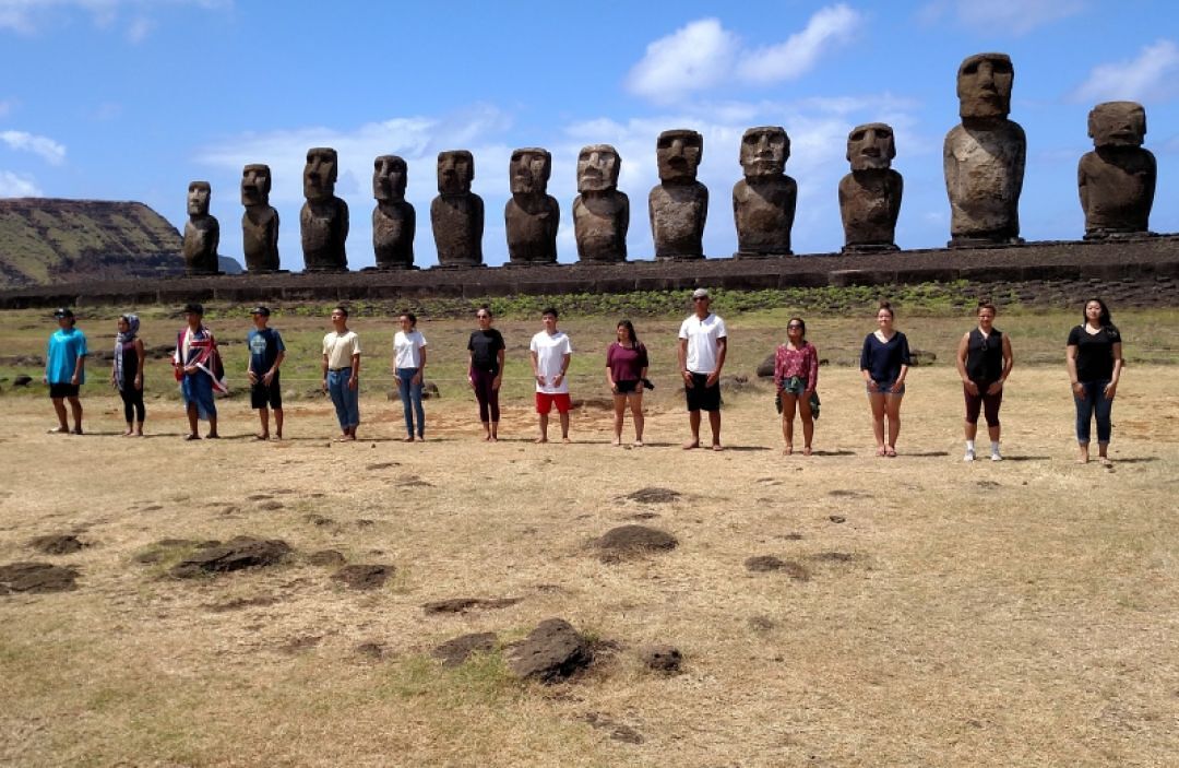 Kamehameha Schools haumāna stand before the Moai in Tongariki, Rapa Nui in 2017.