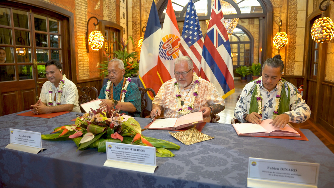 From left to right, Ronny Teriipaia, Minister of Education and Culture of French Polynesia, Dr. Randie Fong, Executive Culture Officer of Kamehameha Schools, The Honorable Moetai Brotherson, President of French Polynesia, and Fabien Mara Dinard, Director of the Artistic Conservatory of French Polynesia TE FARE UPA RAU signing two separate MOUs.