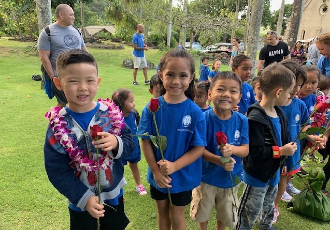 Kamehameha Schools Heʻeia preschoolers at the Kamehameha crypt in 2019, after presenting their ho‘okupu (honored gifts) and tidying up the surrounding grounds.
