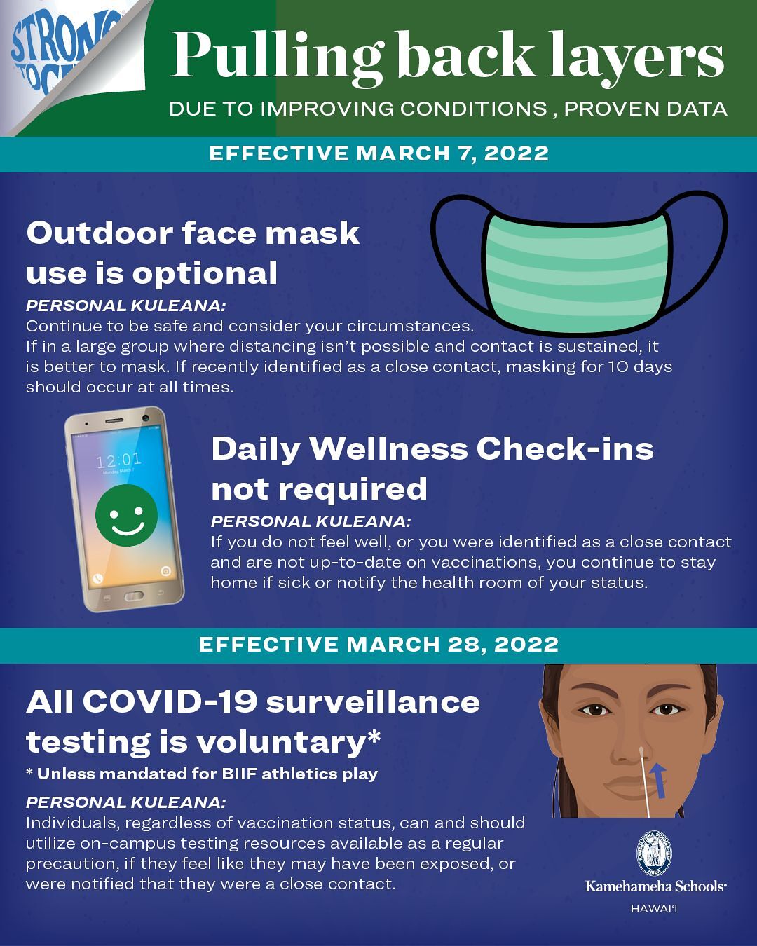 The CDC and DOH had removed the use of wellness checks from school guidance, and the main utility of these checks are to serve as a reminder that the most important thing you can do when you don’t feel well is to stay home. We believe we can reinforce that message through other means, and rely on the personal kuleana of each member of our kauhale to do the right thing for the health of each other. There may still be a need for event or activity specific wellness checks in the future, but as a daily practice, we are confident in letting the checks sunset effective next Monday, March 7.