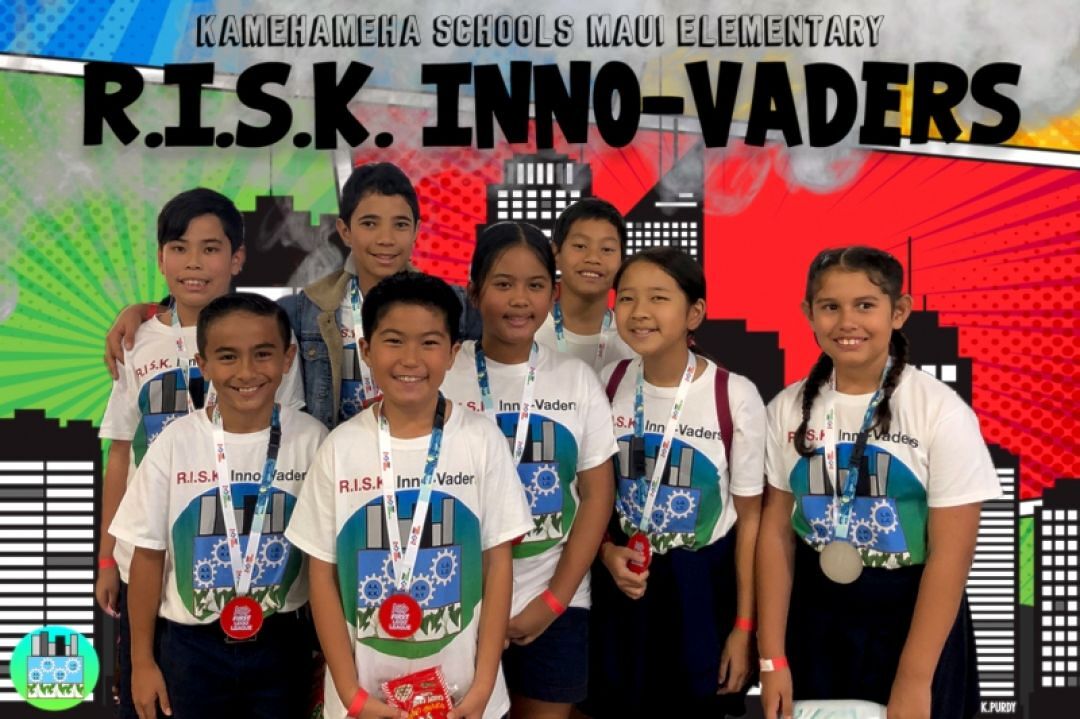 Hoʻomaikaʻi! The R.I.S.K. Inno-vaders represented Kamehameha Maui Elementary School well at the 2019 Hawaii First Lego League State Championship! The team competed in three interviews: Robot Judging, Project Judging. and Core Values Judging; as well as competing in three rounds of robotic matches. This yearʻs project was redesigning the Elementary School using the Minecraft App to illustrate our sustainable initiatives and show how much we mālama our ʻāina.
