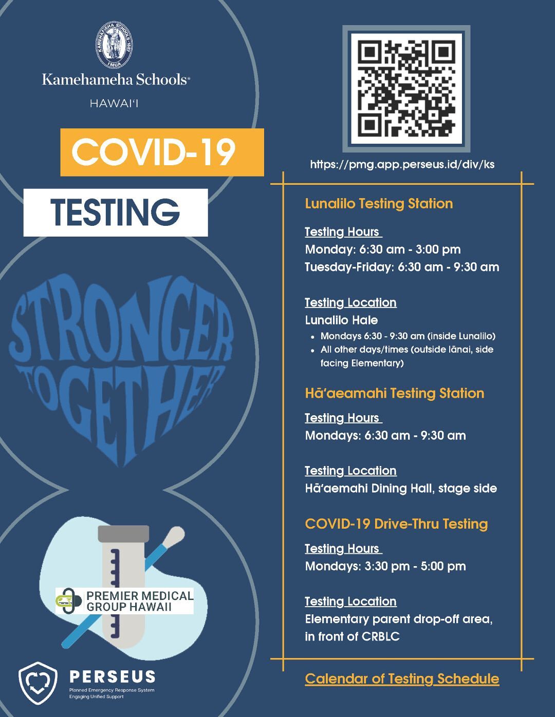 If students are absent on Monday morning, they should test at the Lunalilo Hale station first thing in the morning when they arrive to campus. Check-in with the front office for permission to head to Lunalilo Hale. A calendar with hours and locations and adjustments made for holidays is available and will be adjusted as needs arise.