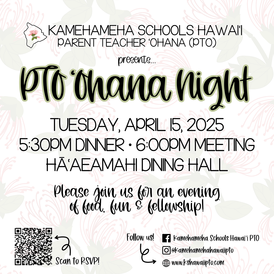 Our Kamehemeha Hawaiʻi PTO will host their annual PTO ʻOhana Night on Tuesday, April 15th! Dinner at 5:30 p.m. with the meeting starting at 6:00 p.m. in Hāʻaeamahi Dining Hall.