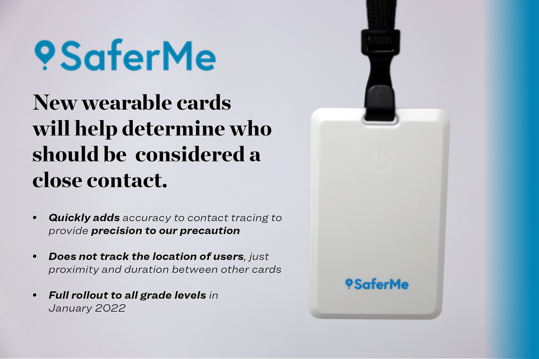 SaferMe badges must be worn on-campus and on bus transportation whenever feasible. Exceptions include sports, especially when competing or in water-based activities, and physical education courses such as biking or swimming. Since no one can predict when, where, or with whom a case may occur, it is critical that everyone take this small step of wearing this badge each day you are on-campus so that we can protect each other.