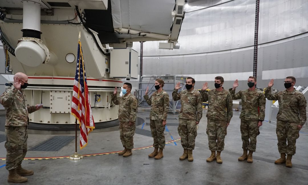 Major Cody Felipe KSM’08 (pictured second to left) is sworn into the U.S. Space Force, in a ceremony held at the Haleakalā summit.