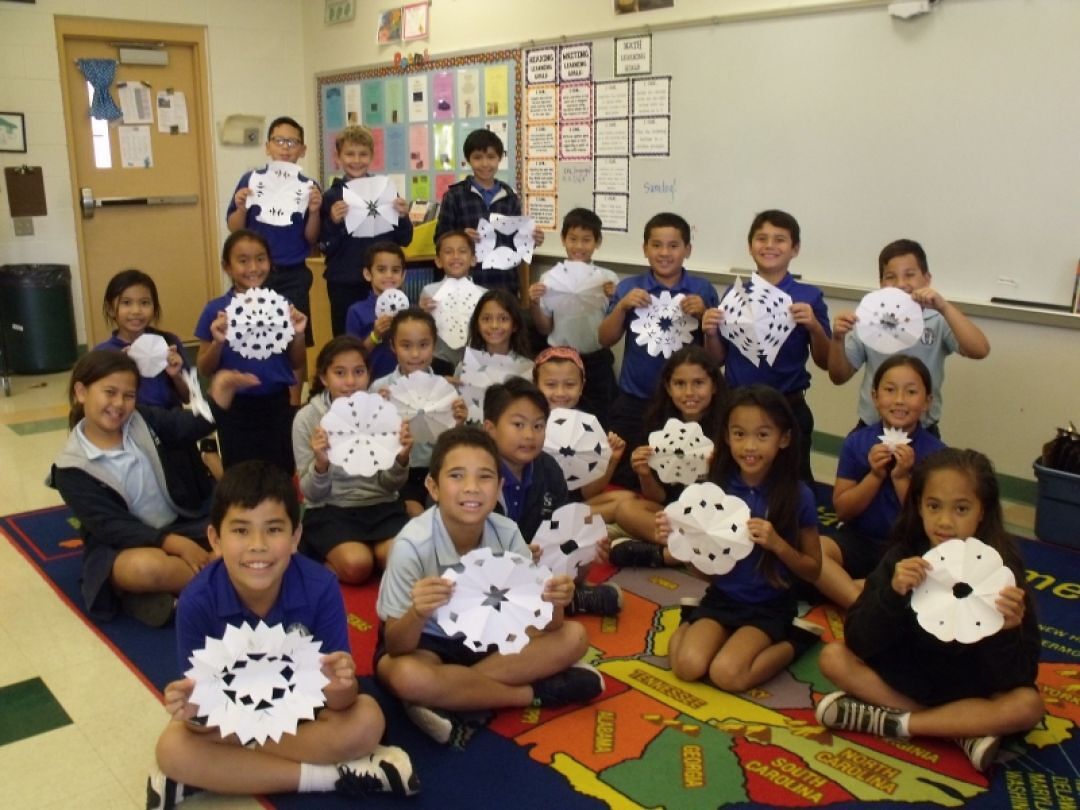 Through trial and error, students learned that the number of folds affected the number of points they made, and the angles they cut affected the shapes and designs on the snowflake. I demonstrated how to make a 6 point snowflake, then had students experiment with their own designs. Students found it was more difficult to create the 8 points than the 12 points and they found cutting the star in the center required more thought than cutting the hole in the center.