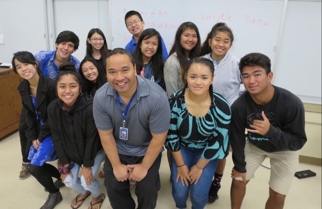 KS Training Instructional Designer Gavon Wong (center) created an online interactive fishing action game that teaches Japanese adjectives. Above, Wong huddles with his KS Kapālama Japanese language students.
