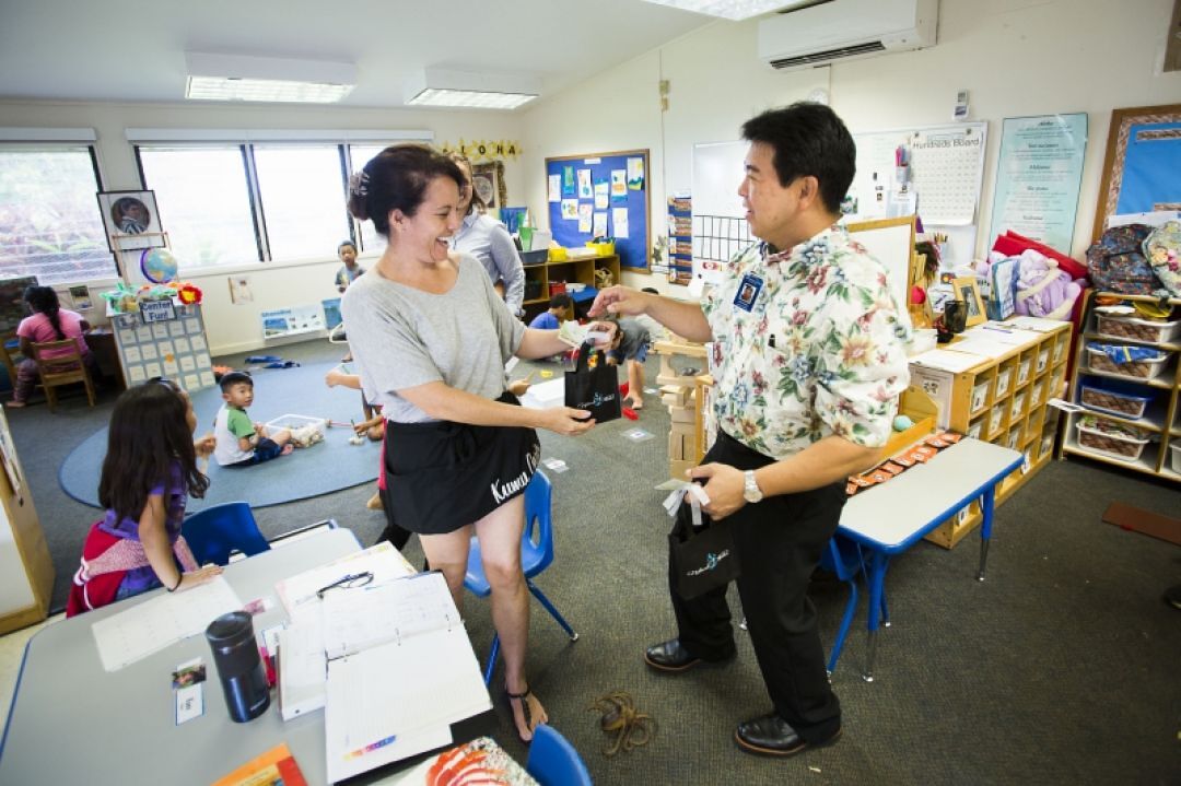 Christine Enrico, a teacher at Kamehameha’s Nānākuli Preschool, is presented with makana by KS Director of Communications Kevin Imanaka as part of the statewide effort to mahalo teachers for their crucial work in uplifting the lāhui.