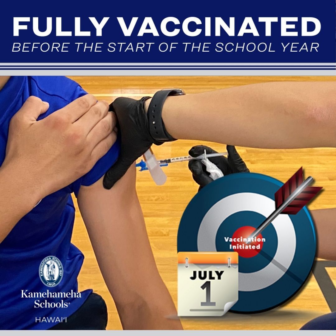 We're encouraging all eligible students, ʻohana members, faculty and staff to at least initiate their vaccinations by July 1, so they can be fully vaccinated by the start of school on August 5.