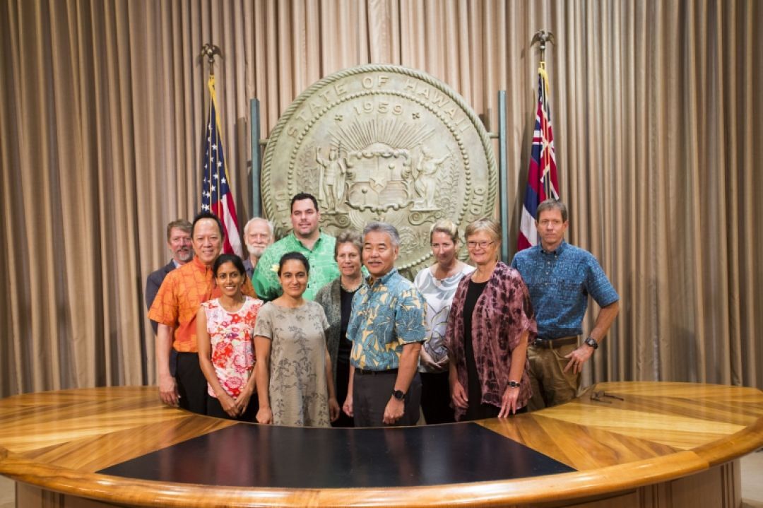 Representatives from the State of Hawai‘i Department of Land and Natural Resources, the U.S. Fish and Wildlife Service, and Kamehameha Schools gather in the governor's office to celebrate the signing of the historic agreement.