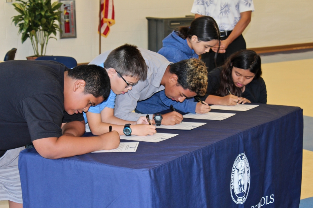 Friday marked a special day as the elected officials of the student government for each class were inducted into their positions. Haumāna campaigned for a week and gave campaign speeches. Voting by grade level was conducted this week. The induction ceremony was conducted during each lunch period; each officer signed a certificate promising to their classmates that they would uphold their duties as elected officials. The certificates were also signed by the Poʻo Kumu Nishikawa (principal), Hope Poʻo Kumu Binkie (vice principal), Kumu Eva and their class advisor kumu. Each officer received a pin and a kukui nut lei. The different colors of the lei represented the officersʻ experiences and challenges ahead: 6th graders received the white kukui lei, 7th graders received the brown lei, and the darkest lei were presented to the 8th graders. Hoʻomaikaʻi to our elected student government officers!