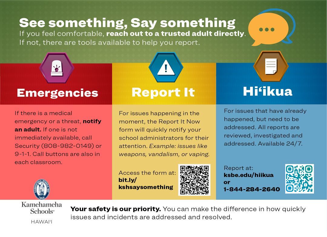 As the world continues to change, we remain dedicated to creating a culture of safety at Kamehameha Hawaiʻi. Mahalo for your partnership in promoting the pono use of these resources for a safe kauhale. If you have any questions, please talk with a member of the administration team or email us at kshawaii@ksbe.edu.