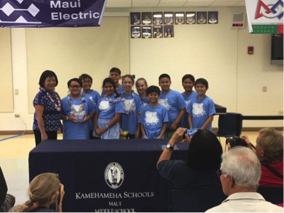 Hoʻomaikaʻi to our Tako Tech Lego Robotics Team, here receiving their Core Values award from a representative from Maui Electric Company.
