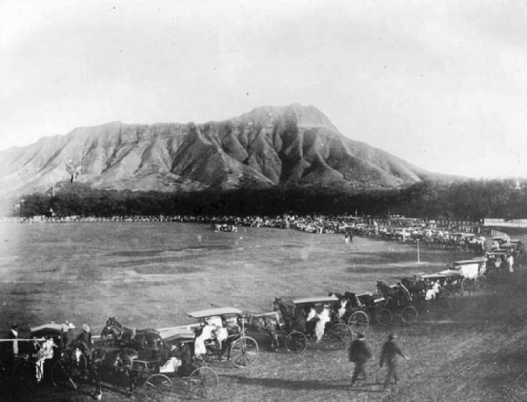 Early celebrations of Kamehameha Day featured carnivals, fairs, and lots of racing – foot races, horse races and even velocipede races. The Hawaiian Language newspaper “Ka Lāhui Hawaiʻi,” dated June 14, 1877, reported that more than 4,000 people gathered at the horse race track where Kapiʻolani Park now sits. King Kalākaua and his consort Kapiʻolani were in attendance and there was even a gunshot salute to remember the warrior king.