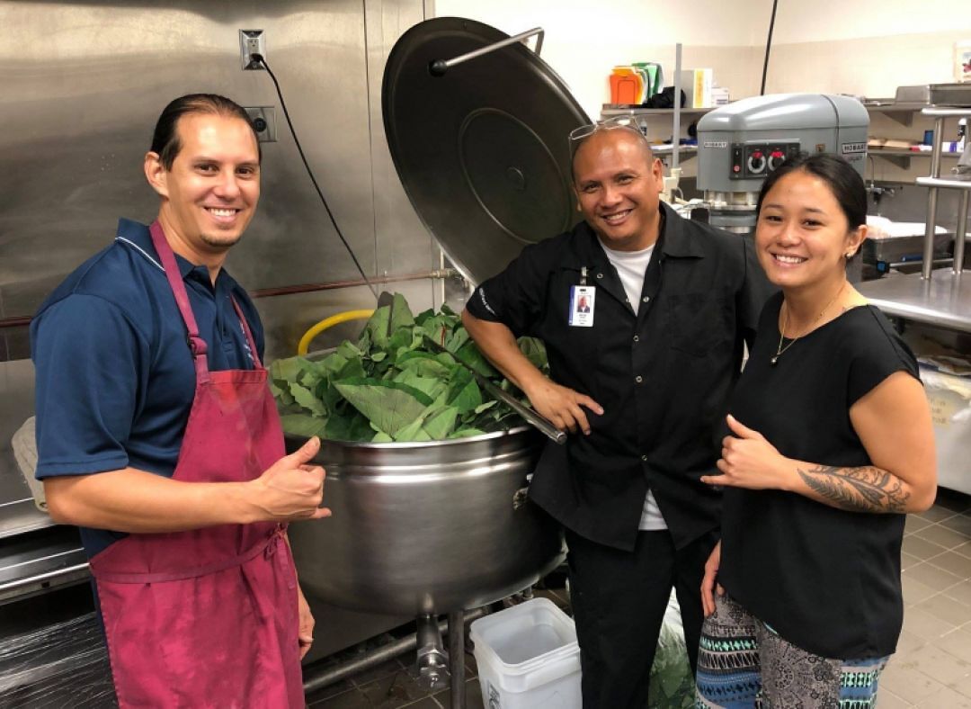 Hawaiʻi’s farm-to-school movement is gaining momentum – putting locally sourced food on lunch plates, growing school gardens, and bringing ‘āina-based education into classrooms. Above, KS Maui Sustainability and ‘Āina-Based Learning Designer and Facilitator Hōkūao Pellegrino, Cook Hector Enriquez, and ‘Ike Hawai‘i Kumu Kēhau Lucas cook up some kalo leaves as part of the campus’ farm-to-school efforts.