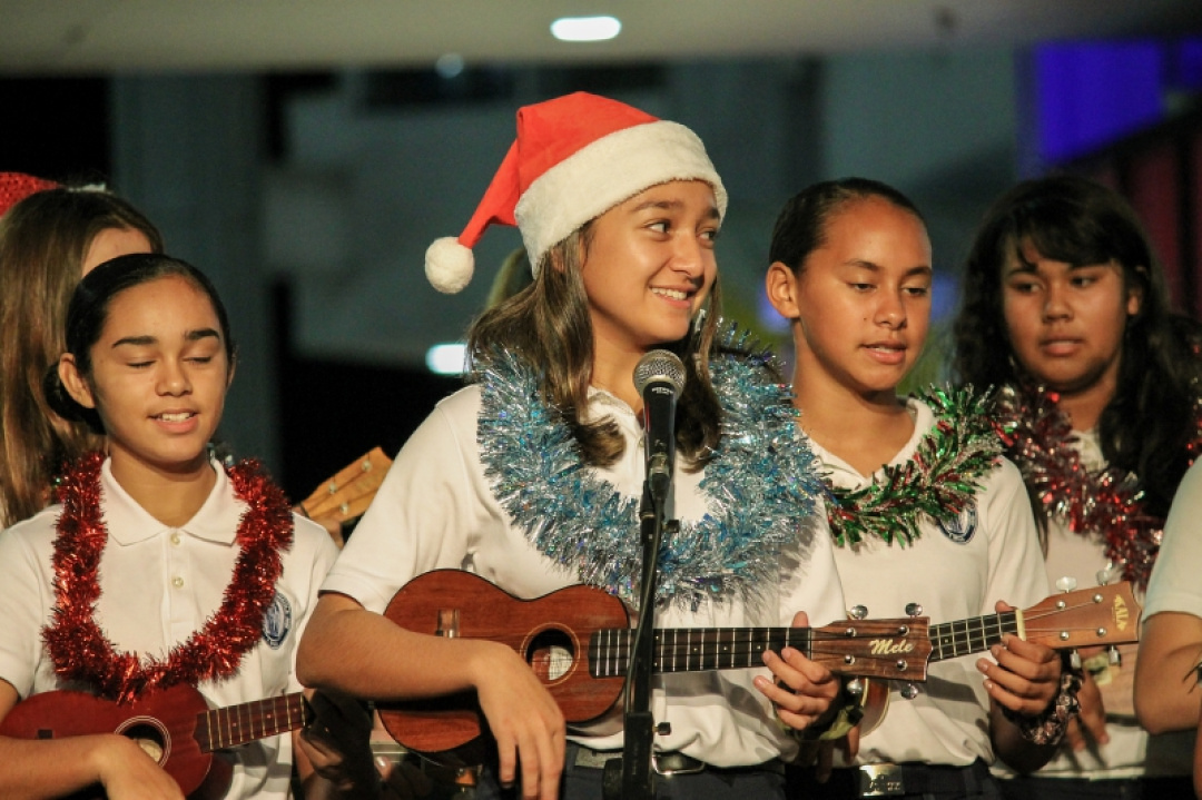 The night was filled with the sound of ukulele’s and our haumānaʻs voices as they performed for an audience and shopper as Queen Kaʻahumanu Shopping Center Wednesday night and accompanied by the MS E mi mau class. The 8th-grade Ukulele class was accompanied by their fellow 7th-grade classmates as they played a 17 song set which included Christmas music and hula. The crowd enjoyed the performance and our haumāna played their instruments with joy and danced beautifully. Big mahalo to Kumu Camarillo & Kumu Hoewaa for their dedication to our haumāna. Their performance is a reflection of their love for the ukulele, hula, and educating our haumāna.