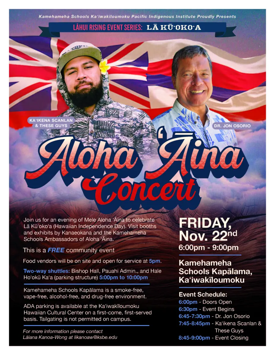 In this season of relaxation and celebration, Kamehameha Schools and the Kaʻiwakīloumoku Pacific Indigenous Institute are proud to bring you a FREE concert event to celebrate Lā Kūʻokoʻa and Makahiki.