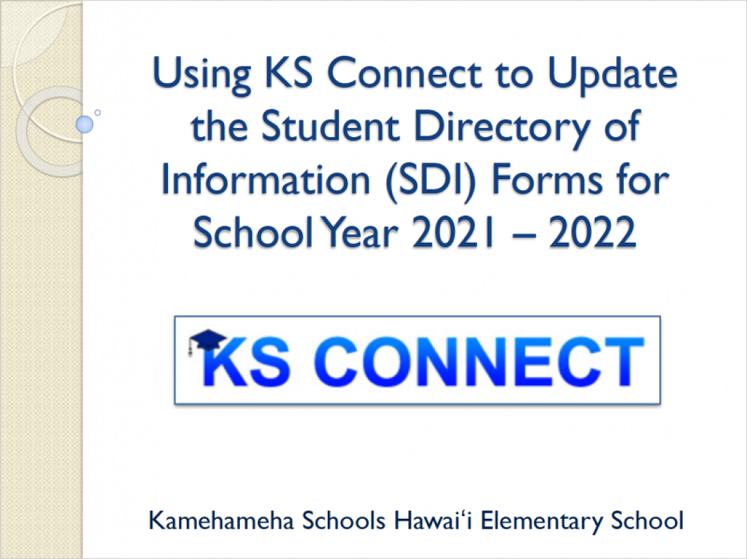 Our Kula Haʻahaʻa Administration will be using KS Connect to update your child’s Student Directory of Information (SDI) forms for the 2021-2022 school year. You will be able to update your child’s SDI forms online by logging into your KS Connect parent account from April 1, 2021 – May 15, 2021.