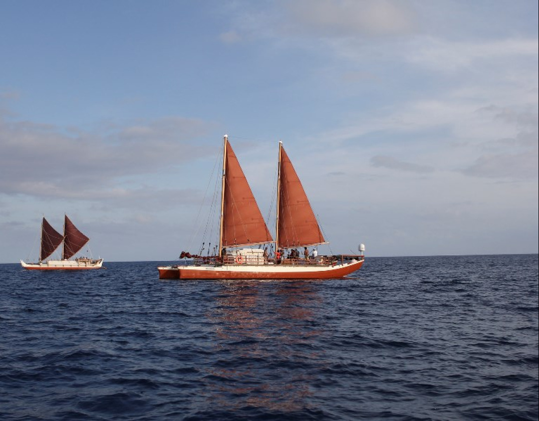 Hōkūle‘a’s sister canoe Hikianalia will return to Hawaiʻi for a year before sailing to the west coast of the U.S. as part of the Mālama Honua Worldwide Voyage. The new sail plan will allow for more educational engagement. ® Polynesian Voyaging Society image courtesy of ʻŌiwi TV. Photo by Kaipo Kiʻaha.