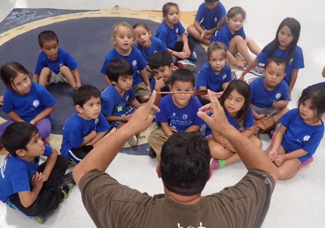 Hoʻokahua Senior Program Manager and Hikianalia crew member Mark Ellis teaches keiki from the KS Koʻolaupoko Preschool about the parts of a waʻa (canoe).