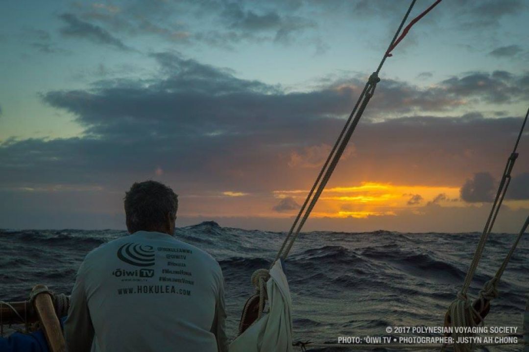 Captain Bruce Blankenfeld watches the sun rise for the first time in 2017 as the waʻa navigates its way to Panama.