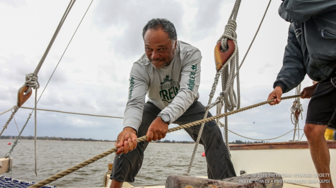 Crew member Kālepa Baybayan pulls his weight as Hōkūleʻa makes its way to South Africa.