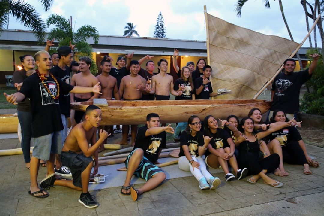 Poʻokela Academy students from Castle High School gather around one of the three waʻa they hand carved as a culminating project of their school year.