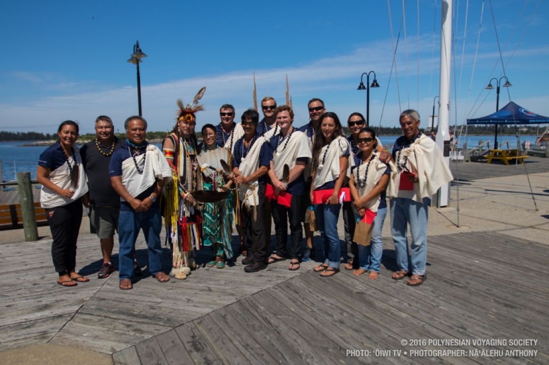 Captain Kālepa Baybayan presents an ipu on behalf of the voyage to the Mi’kmaq tribe and Yarmouth community.