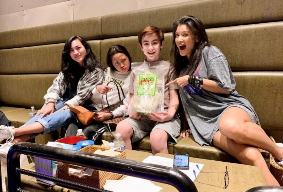 Lindsey Watson KSM ’13 (left) and Kelly Hu KSK ’86 (right) with “Finding ‘Ohana” keiki actors Kea Peahu and Owen Vaccaro.