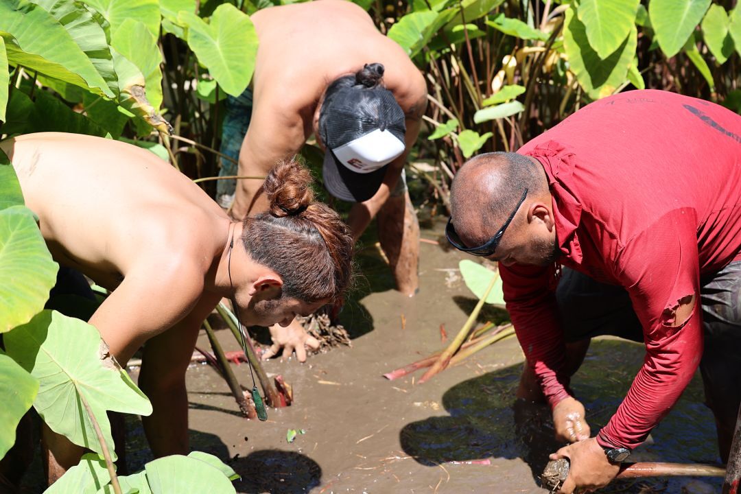 Another group got knee-deep to huki and began processing kalo that would be part of ‘aina ahiahi the next day. One of the Nā Mamo alakaʻi, Holden Kalamaʻehu Takahashi KSM’10, used the huki time as a hands-on opportunity to teach ‘ōlelo Hawaiʻi as well.