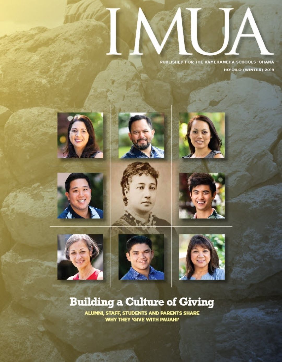 The winter 2019 issue of I Mua Magazine honors Pauahi’s legacy of giving by celebrating individuals and groups who have chosen to “Give with Pauahi.” As a publication, I Mua informs and inspires through storytelling that engages alumni and other important members of our donor community by framing the breadth and impact of Kamehameha Schools and its mission of strengthening the capability and well-being of Pauahi’s people through education.