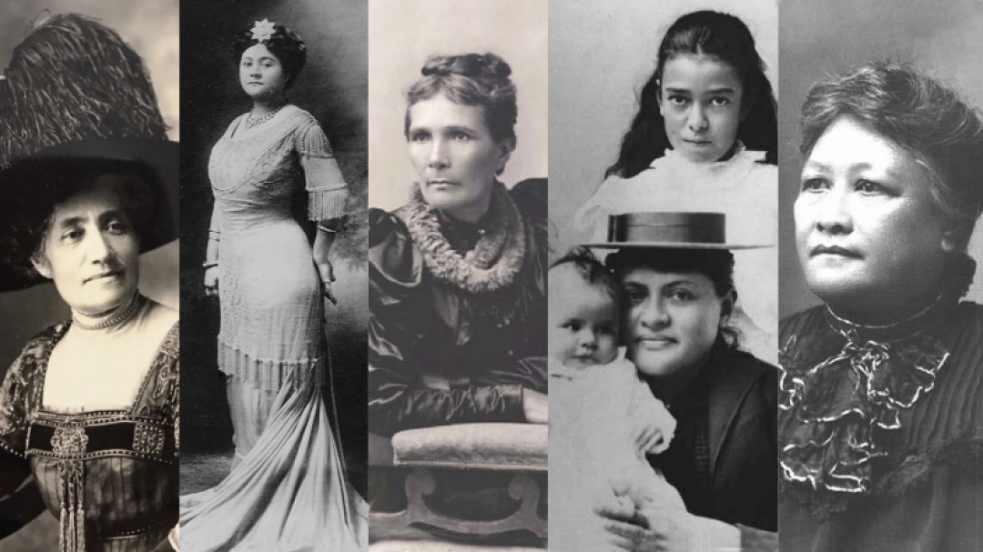 In honor of the 2021 National Women’s History Month theme: “Valiant Women of the Vote: Refusing to Be Silenced,” our Kūkahekahe column shares the mo‘olelo of wāhine aloha ‘āina (patriotic women) who helped achieve women’s suffrage and the restoration of women’s political power in the late 1800s and early 1900s. They include (l-r): Emilie Kekāuluohi Widemann Macfarlane, Elizabeth Kahanu Kalanianaʻole, Emma Metcalf Beckley Nakuina, Abigail Kuaihelani Campbell and children, and Emma ʻAʻima Nāwahī.