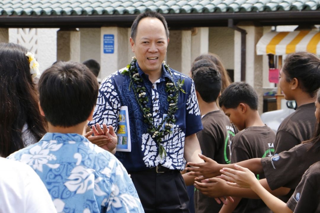 KS CEO Jack Wong will be among the influential local executives sharing their leadership mana‘o with next-generation leaders at the July 27 “Hawaii Business” magazine Leadership Conference. Above, Jack congratulates some future Hawaiian leaders - KS Kapālama fifth graders, after their annual play.