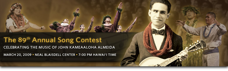 This year’s contest celebrates the music of John Kameaaloha Almeida, fondly remembered as “The Dean of Hawaiian Music.” This prolific composer distinguished himself over a 70–year musical career, creating a legacy of over 200 mele which are still enjoyed today.